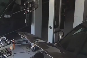 修车小伙干活时,引擎盖慢慢将“嘴巴”合上,正巧砸在小伙的腰上