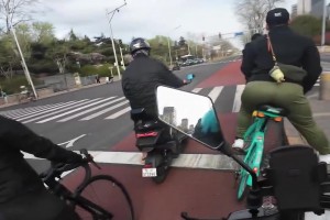 男子骑自行车在路口,撅着屁股等着绿灯冲刺